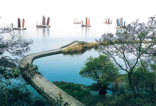 烟波浩渺的太湖,是我国第三大淡水湖。湖区有 48岛、72峰,湖光山色交相辉映。它地跨江浙两省,北临无锡、南濒湖州、东邻苏州、西接宜兴。然而,太湖风景最美处,还在无锡鼋头渚风景区。鼋头风光,山清水秀,天然浑成,为太湖风景的精华所在,故有“太湖第一名胜”之称。当代大诗人郭沫若“太湖佳绝处,毕竟在鼋头”的诗句赞誉,更使鼋头渚风韵流扬境内海外。