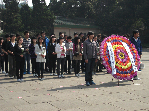 到达烈士陵园后,同学们向革命烈士敬献花圈,物联网学院分团委副书记孙健致悼念词,深深地表达了同学们对烈士们的哀思以及坚决承担肩上的历史责任与使命的信念。随后全体同学默哀三分钟,表达自己的缅怀之情。
