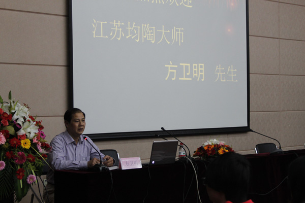 方卫明首先向到场听众介绍了均陶,用图片展示了自己的作品“降龙伏虎”、“三鹰”、“其乐融融”等,随后结合社会背景、经济环境等阐述了各个时期均陶的发展情况。方卫明还讲述了自己在法国期间的经历,在坎坷的历程中他用高超的技艺征服了曾将他忽视的法国人,赢得了法国陶艺大师的尊重。最后,方卫明还回答了同学们的提问,勉励大家提高自身艺术修养。