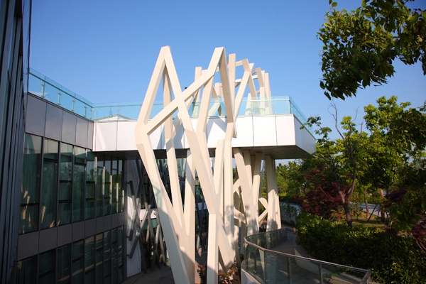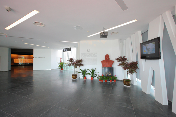 步入美术馆大厅,程及先生的半身塑像淡然矗立, 14分钟的专题纪录片,向人们讲述着大师的艺术人生。多媒体技术呈现在白色背景墙上的枫叶缓缓飘落,映衬落地玻璃幕墙外抽象的树枝,寄予程及思念故乡、落叶归根的思绪,意境悠远。地上和地下的两个主、次展厅,均采用不规则设计,小巧而富有艺术感,可一次性陈列书画作品 30余幅,程及先生捐赠的80多幅作品在此轮流展出。展厅配备的自动感应灯光,只有当观众靠近展品时,灯光才会慢慢启动,既节约了能源也有利于作品保护。综合展厅则作为国内外著名画家交流展览所用,作品展示厅和库房还配置了恒温恒湿设施和安全装置。创作办公区设有四个可供研究、交流的艺术创作室,观众休息区还有咖啡茶社、休闲茶吧。在一楼与平台眺湖区的连接处,采用了阳光天井的设计概念,自然光有效补充了内部照明,同时使得美术馆更加通透和富于现代感。