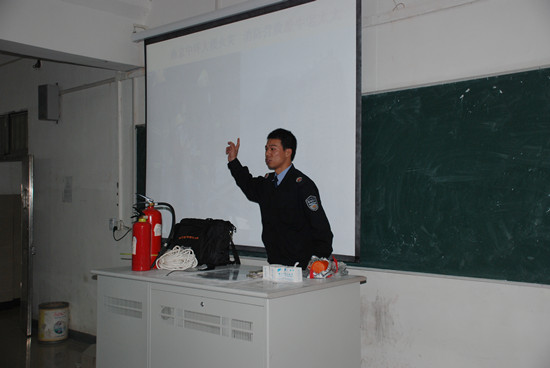 潘教官根据学校实际情况,结合最近几年全国发生的重大火灾实例,并提供了最近几年全国发生的典型火灾案件的数据与图片,用“血的教训”警示我们要高度重视消防安全,不断增强消防安全意识,加强消防安全管理,积极主动做好消防安全工作。他从火灾的预防、火灾的种类、用电安全常识三个方面对全体教师进行了讲解,使大家了解了手电筒、消防绳、灭火器、防毒面具等消防四宝,明白了遇到火灾时应冷静的使用报警、灭火、逃生三种处理方式,同时向大家讲解了在发生火灾时如何安全切断电源、怎样将毛巾折叠浸湿、如何有效逃生等。同时针对大家在实际工作中遇到的一些问题进行了解答,提高其对消防安全工作的认识和了解。