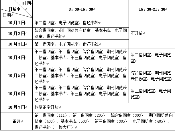 太湖校区图书馆开放时间:10月1、2、3日,8:30~16:30;10月4、5、6日,8:30~21:30(各室开放情况详见附表)。10月7日起恢复正常作息时间。