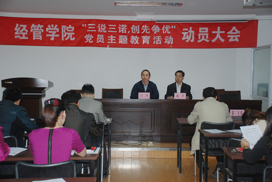 10月14日,经济管理学院党总支在中桥校区实验楼第一会议室举行全体党员大会,启动了2014-2015学年“三说三诺,创先争优”党员主题教育活动,进行党员目标管理责任书现场签约仪式。经管学院党总支全体师生党员参加了会议,周桂瑾副校长以第三支部普通党员身份出席了大会。