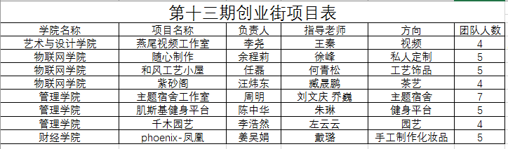 根据公告栏《关于继续征集大学生创业街创业项目的通知》要求,经学生本人(团队)申请、院系推荐、专家初评、现场答辩、学校审核等环节,现拟定“燕尾视频工作室”等8个项目为我校大学生创业街第十三期入驻项目,现予以公示。