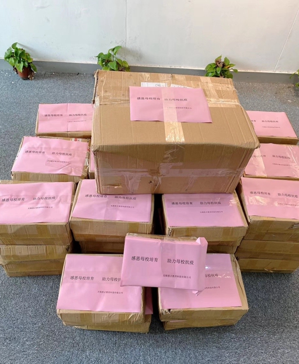 孟稚然表示,作为毕业生,十分感念母校的培育之恩,希望能为母校的疫情防控工作贡献力量。据悉,无锡恩才教育科技有限公司主要经营教育培训和技能培训,公司员工主要由我校校友组成,此次为母校捐赠400瓶84消毒液、1000个口罩。