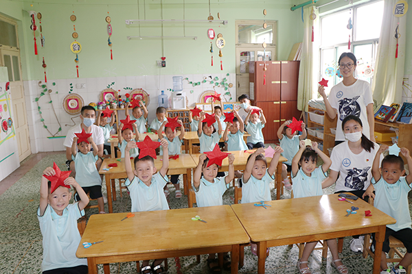 7月21日上午,实践团队赴第三站淄博市沂源县荆山路幼儿园,开展“童心向党,传承剪纸非遗文化”活动,小朋友们兴奋地传阅着一幅幅剪纸作品,惊异于传统剪纸的精湛,跃跃欲试,在团队队员的指导和帮助下,小朋友们以国与家为主题,完成了一幅幅充满童真的作品。