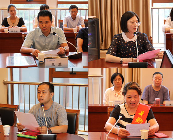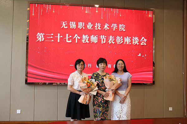 党委副书记周桂瑾宣读了2021年江苏省先进工作者表彰文件、2021年江苏省 “青蓝工程”培养对象评审结果、2021年“无锡职教名师工坊”评审文件、学校从教三十年人员名单,许雪芬教授荣获2021年江苏省先进工作者、2021年“无锡职教名师工坊”教学名师称号,周春兰老师获2021年“无锡职教名师工坊”优秀思政课教师称号、赵爽等七名老师获批成为2021年江苏省“青蓝工程”培养对象,杨雪琴、熊英、张晓雁、任文波、张宁菊五位老师荣获2021年度无锡市三十年教龄荣誉证书。