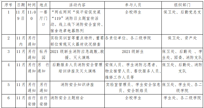 2021年11月9日是第31个全国“119”消防日,今年的主题是“落实消防责任,防范安全风险”。为贯彻落实省委、省政府进一步推进全省教育系统安全专项整治三年行动深入开展的指示要求,进一步推进校园消防安全宣传及管理工作的开展,进一步提高全校师生的安全防范意识和面对火灾等灾情的应急能力。现决定开展2021年“119”校园消防宣传月系列活动暨新生消防演练活动。具体安排如下:
