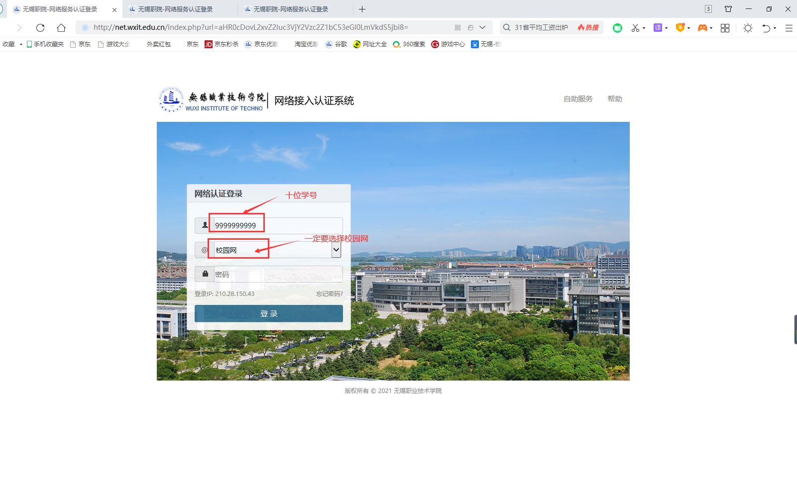 提醒:学生用户一定要选择校园网。