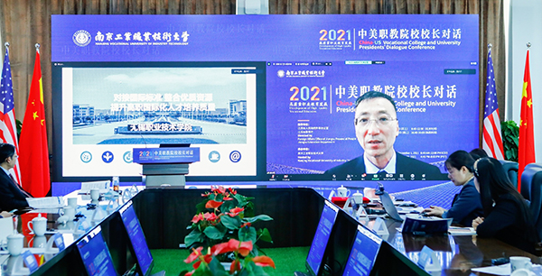 12月1日,在江苏省人民政府外事办公室、江苏省教育厅指导下,江苏美国高职教育合作联盟主办的“中美职教院校校长对话”活动在南京举行。本次对话活动主题为“高质量职业教育发展”,旨在分享中美职业院校国际合作实践经验,探讨江苏-美国职业院校高质量职业教育合作的实施方案。江苏省教育厅副厅长曹玉梅,江苏省外办副主任刘建东出席活动并致辞,美国职业院校代表也在线出席了论坛。我校校长龚方红应邀参加活动并作主题报告。
