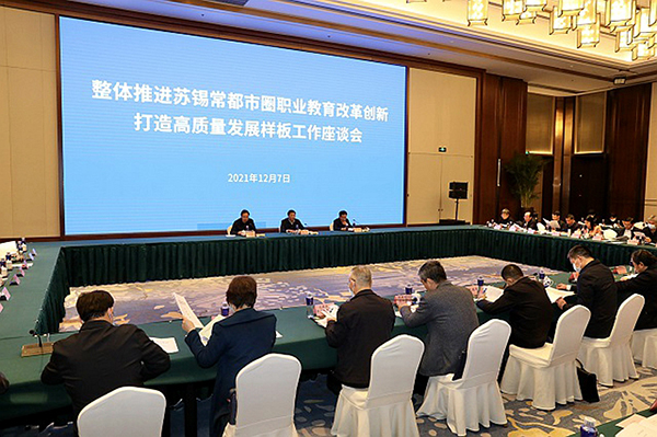 12月7日下午,由省政府办公厅组织召开的“整体推进苏锡常都市圈职业教育改革创新、打造高质量发展样板工作座谈会”在常州召开,副省长马欣出席会议并讲话,苏锡常三市分管副市长和教育局主要负责同志参加会议。我校党委书记朱爱胜出席座谈会并发言。
