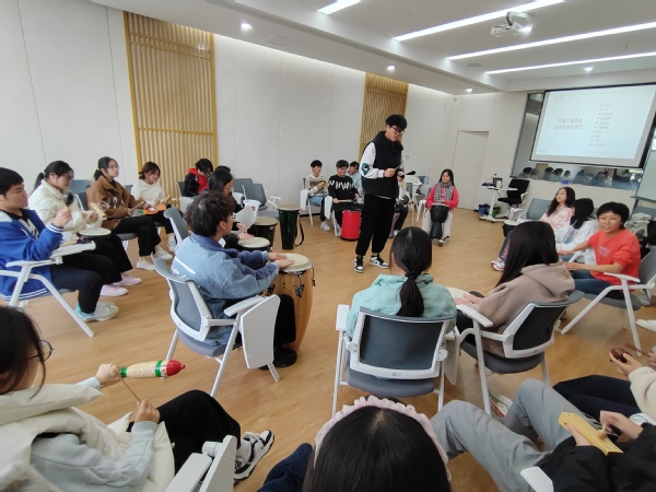 活动中,林佳燕为同学们讲解了鼓圈的基本演奏方法和手势语言。大家通过敲击非洲鼓和各种小打击乐器来传递自己的想法、聆听对方的心声,达到释放压力、舒缓心情的效果。随着团队的融合度越高,鼓圈的音乐性逐步提升,在节奏和声音的变化组合中,现场音乐时而急促、时而缓慢、时而激情高亢、时而温柔细腻,大家相互支持、配合,共同进行了一场精彩纷呈的鼓圈演奏。