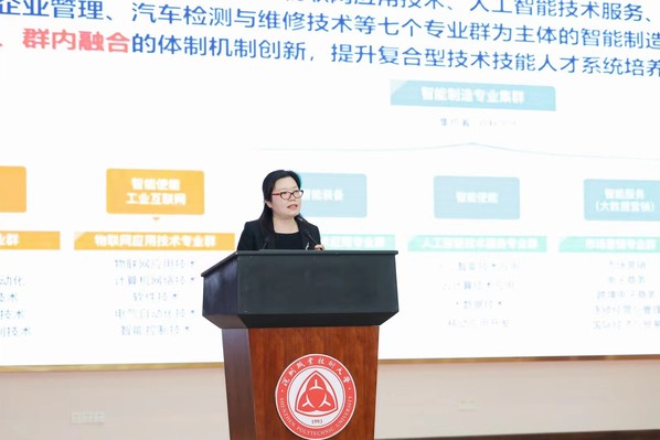 会上,吴慧媛作了题为《深化产教融合、推进科教融汇,赋能职业教育高质量发展》的主题报告,从职业教育高质量发展的政策导向、产教融合办学改革创新实践探索、科教融汇塑造发展新动能新优势等三个方面进行阐述,展示了我校在构建“技术引领、并跑产业”的产教融合办学体系架构、深化产教融合集成大平台建设、服务智能制造专业集群建设等方面的探索实践经验以及取得的成效,并介绍了我校在实施科教融汇道路上针对完善科研体系、建设科研实验室集群、服务区域企业、推进科技成果转化等方面的做法。
