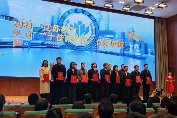 3月21日,2024年全省教育新闻宣传工作部署推进会在南京召开,会上发布了2023年度教育新闻宣传优秀单位、教育新媒体建设优秀单位榜单,我校获评江苏教育新闻宣传工作优秀单位和江苏教育“十佳新媒体”优秀单位。校党委副书记杨雪琴受邀参加会议并作为代表上台领奖。
