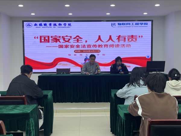 为了增强大学生对国家安全法的理解,提高他们对国家安全的意识,同时激发其阅读兴趣,提升阅读水平,4月11日下午,物联网工程学院在图C-401教室举办了以“国家安全,人人有责”为主题的国家安全宣传教育读书活动。学院分团委书记、辅导员以及来自各年级的学生代表共计80余人共同参与活动。