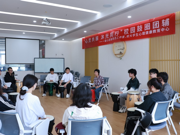 鼓圈是一种无需音乐基础就可以开展的即兴团体演奏形式,它甚至不用语言,就可以在短时间内充分调动演奏者的视、听、触等感官,达到释放压力、疏通动力、融入团体的效果。4月23日下午,大学生心理健康教育中心联合设计艺术学院“一亩心田”辅导员工作室,开展了“心灵共振,沐光同行”校园鼓圈团辅活动,来自全校多个院系和部门的20多名师生参与活动。
