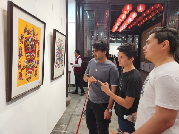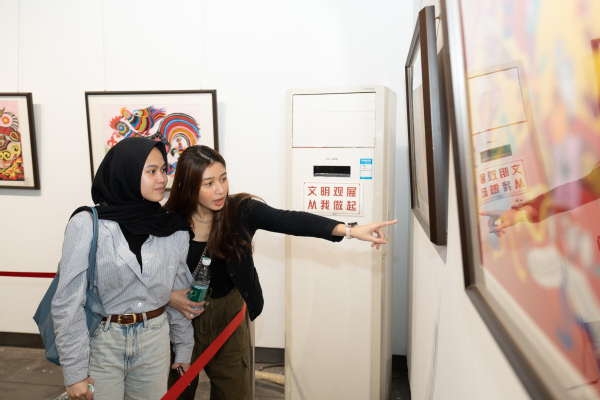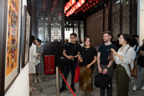 开幕式上,一曲清丽婉转的《太湖美》在古色古香的工字殿展厅映衬下,尽显无锡水乡的江南雅韵,使得留学生们沉醉其中。活动现场展出了近百幅具有陕北独特风格的、被列入陕西省第一批非遗名录的“陕北农民画”,均为延安市文化馆民间美术典藏精品,所展作品以讴歌新时代、展现新气象、表现人民群众美好生活的幸福场景为主要题材。它们构图奇美、想象力丰富、用色大胆,深受留学生们的喜爱,“这些色彩大胆又极具生活气息的民间画,是如此的生动有趣,仿佛亲历了乡村生活”来自泰国的留学生TOOBANTERNG MISS KULNAREE情不自禁感叹道。