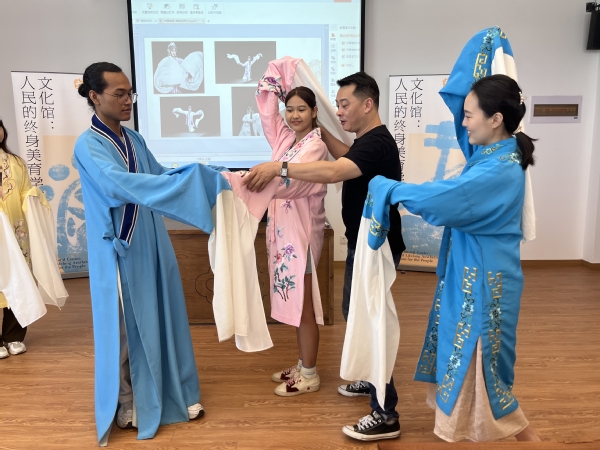 在互动环节,姜雪峰手把手教留学生体验扇子功,只见留学生在指导下右手持扇柄,眼看扇子,含胸亮相。左手的中指用指头勾着扇子左侧的骨架,往左侧慢慢地轻拉,右手的中指,无名指,小指捏住扇柄,眼看扇叶慢慢展开。随后,留学生们穿上自己喜欢的戏服,在姜雪峰和顾津瑞两位老师的指导下,学着单指、转眼、连步等基本动作,现学现用,一招一式有模有样,留学生们沉浸式感受锡剧的魅力,真正学习到戏曲文化知识。姜雪峰表示,锡剧是跨越几百年的传统戏剧,作为国家级非遗,锡剧文化博大精深,我们想让更多的留学生了解锡剧,感受锡剧的艺术魅力。
