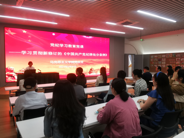 参观结束后,马克思主义学院党总支书记赵后起在现场为全体党员教师讲授党纪学习教育党课——《学习贯彻新修订的<中国共产党纪律处分条例>》,通过阐释注重纪律建设是党的优良传统和政治优势、《中国共产党纪律处分条例》的历史沿革和主要内容等引领党员教师深刻认识我们党是用革命理想和铁的纪律组织起来的马克思主义政党,全面从严治党,重在加强纪律建设,警示党员教师树立并践行正确的纪律观、廉洁观,增强纪律观念和廉洁意识,做到心有所畏、言有所戒、行有所止。