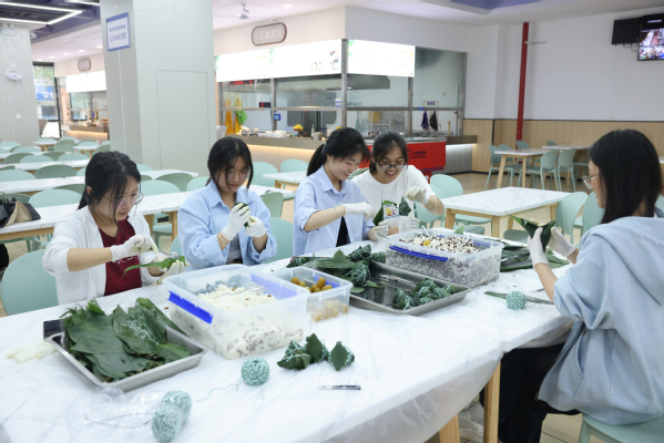 活动现场,餐厅工作人员早早把泡好的糯米、粽叶、红豆、蜜枣、葡萄干、粽叶、棉绳等材料整齐地摆放到位,师生们纷纷动手,从折粽叶、填糯米、裹叶子到扎线,每一个步骤都显得有条不紊,一个个形态各异的粽子在他们的巧手中诞生。粽叶的清香和糯米的甜香交织在一起,营造出浓厚的节日氛围。许多师生都是第一次包粽子,看着自己亲手包好的粽子,成就感油然而生。