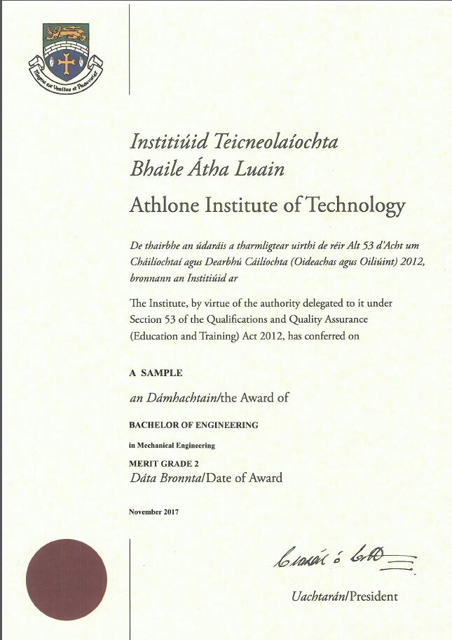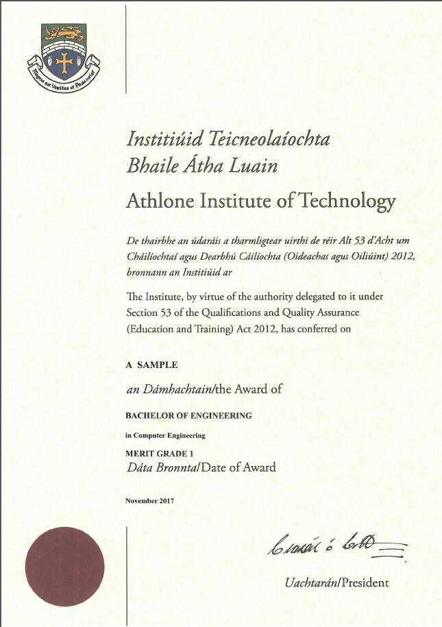 爱尔兰阿斯隆理工学院荣誉学士学位证书