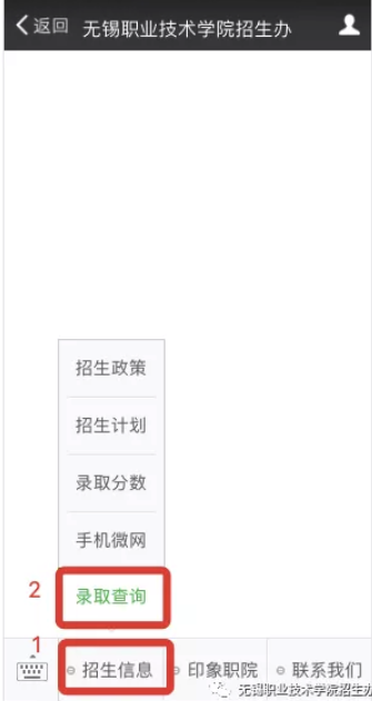 二、通过学校招办公众号底部菜单栏(招生信息-录取查询)查询。