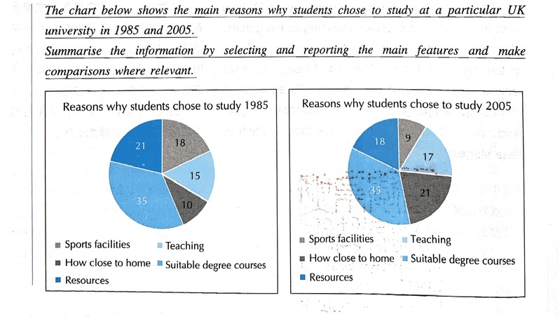 Shown in the two pie charts are the five reasons students chose a certain university in 1985 and 2005. It can be seen that there was little or no change for suitable degree courses and teaching,butcloseness to home increased,whilesports facilities decreased.