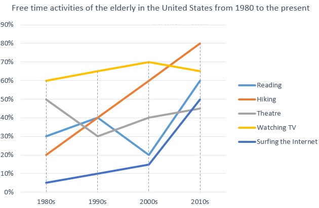 This century, hiking, reading, going to the theatre and surfing the Internet have all been increasing in popularity. However, watching TV has beendecreasingin popularity. Despite this, watching TV is still the second most popular activity nowadays amongst this group. Most elderly people are hiking nowadays in their spare time.