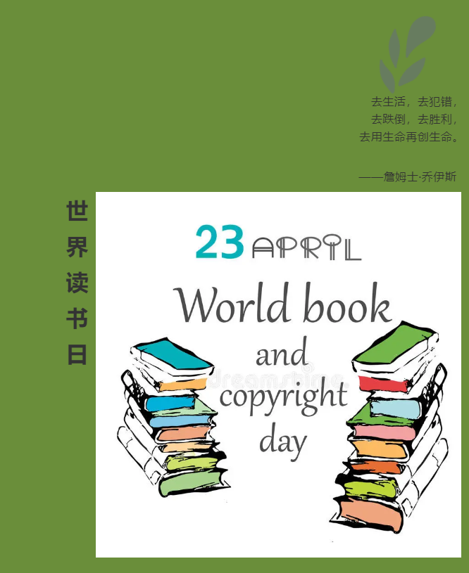 4月23日世界读书日全称“世界图书与版权日”,又称 “世界图书日”。最初的创意来自国际出版商协会。1995年11月15日正式确定每年4月23日为“世界图书与版权日”。其设立目的是推动更多人去阅读和写作,希望所有人都能尊重和感谢为人类文明做出过巨大贡献的文学、文化、科学、思想大师们,保护知识产权。