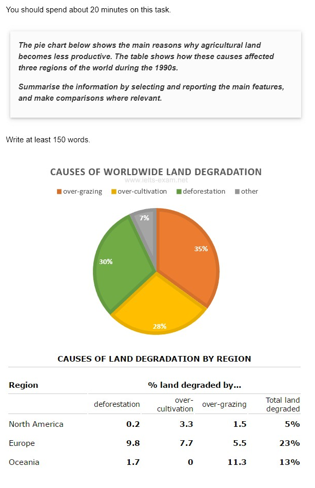 In contrast, Oceania had 13% of degraded farmland and this was mainly due to over-grazing (11.3%). North America had a lower proportion of degraded land at only 5%, and the main causes of this were over-cultivation (3.3%) and, to a lesser extent, over-grazing (1.5%). Overall, it is clear that Europe suffered more from farmland degradation than the other regions and the main causes there were deforestation and over-cultivation.