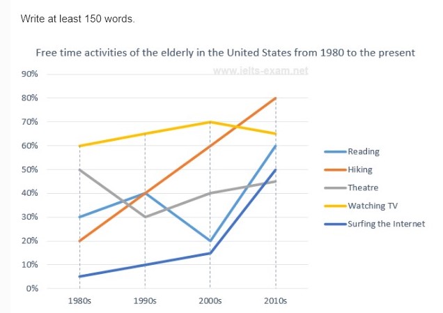 This century, hiking, reading, going to the theatre and surfing the Internet have all been increasing in popularity. However, watching TV has been decreasing in popularity. Despite this, watching TV is still the second most popular activity nowadays amongst this group. Most elderly people are hiking nowadays in their spare time.