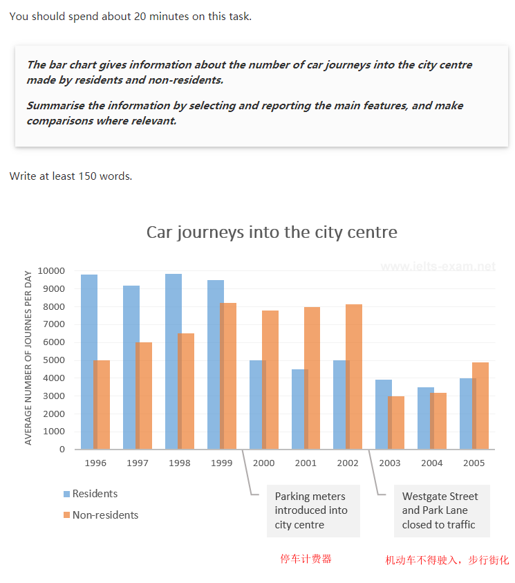 The graph shows the number of car journeys into the city centre made by residents and non-residents over a ten year period. In 1996 an average of just under 10,000 journeys per day were being made by residents, while approximately half that number were made by non-residents. Over the subsequent three years, resident journeys remained reasonably stable, while non-resident journeys increased each year, exceeding 8,000 per day in 1999.