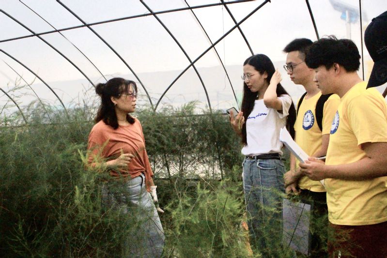 调研团实地走访了徐周村芦笋种植基地,这是徐周村最具代表性的合作社。在这里,队员们看到了郁郁葱葱的芦笋,“芦笋是一种“坚强而又娇气”的植物,它不需要像其他作物那般每年播种,芦笋本体能存活十几年,食用部分的芦笋沿芦笋根茎边上生长,类似于竹笋,3-12月份每天都会有新鲜芦笋。但芦笋对于温度要求与采摘要求较高,每天凌晨3、4点是最佳采摘时间,太阳升起后采摘则会伤害芦笋。”徐经理如是介绍,给队员们实实在在的上了一节农业科普课。随后,队员们对芦笋进行了仔细观察,学习了芦笋的其他相关知识。