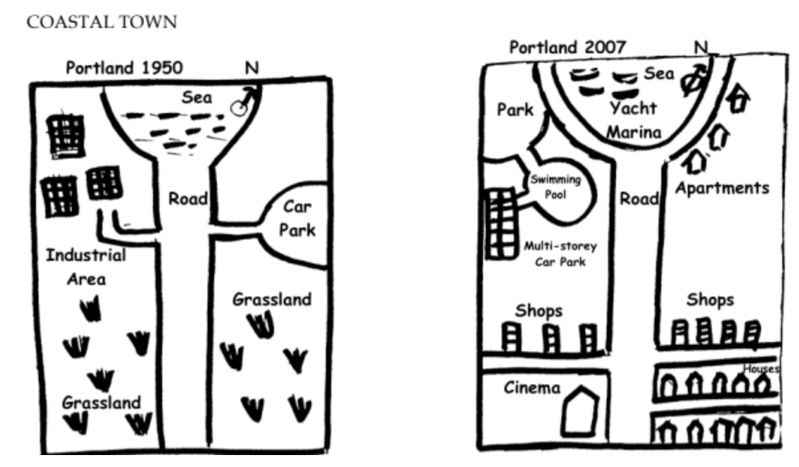 下图显示了沿海城市Pentland在1950年至2007年间发生的变化。可以看出,在57年的时间里,该地区有了很大的发展。