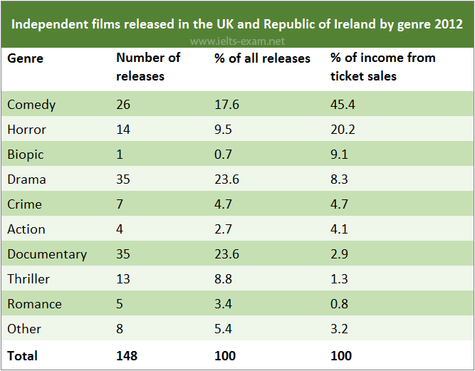 The table provides information about different types of independent films released in the UK and the Republic of Ireland in 2012. It indicates how many films of different genres were made and also shows what proportion of total ticket sales was made by each kind of film.
