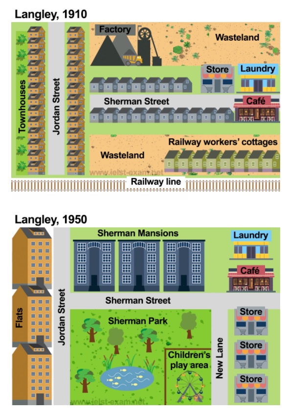 The two maps show the town of Langley in the years 1910 and 1950 and the urban developments that took place. Overall, there were a number of notable changes to the buildings and amenities of this area.
