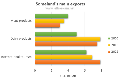 This figure has increased slightly, so that now, in 2015, it has reached almost $7 billion. It is estimated that international tourism will continue to grow so that by 2025, it will be earning around $8 billion for the country. In 2000, dairy exports were worth around $5 billion, but since then there has been a dramatic increase, and sales for this year are approximately $8 billion. Experts are predicting that exports in this area may fall slightly, so a figure of $7.5 billion is expected for 2025. Meat products are the third key industry in Someland, but sales have dropped since 2000 and now stand at $3.5 billion. It is expected that sales will continue to decrease in the future.