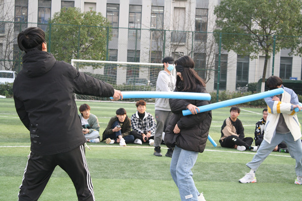 第二个游戏活动,每组选出一名同学,戴上眼罩,手持海绵软管,在指定区域完成五个转圈之后,击打其他游戏成员让其淘汰。游戏开始后,场下指导的同学积极互动,蒙眼的同学们虽看不见彼此但通过场下组员的指导,场上场下相互配合即可快速的击中对手,游戏进行中大家热情参与,在紧张的竞争气氛中也充满了欢乐的氛围。