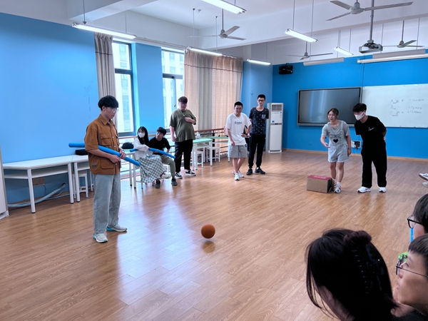 本次活动由爱尔兰学院分团委组织,设置了“击鼓传球”,“蒙眼快打”,“瓶子保龄球”三个游戏项目,并且在游戏中表现出色的小组还能获得奖品。首先开始的是“击鼓传球”游戏,随着主持人一声令下,鼓声响起,围坐在一起的同学们开始依次传球,待鼓声停止,手上有球的同学则需要回答主持人提出的关于端午节习俗的问题,若回答不上来或打错都需要现场表演才艺作为惩罚。然后是“蒙眼快打”游戏环节,每位同学都大显神通,凭借自己与队友的默契与信任,成功击败对手,让在场的观众为之喝彩。其中,大一年级的廖宁鑫同学更是过五关斩六将,在与队友们的默契配合下,创造了一人淘汰一组6位同学的精彩战绩。最后开展的是“瓶子保龄球”,游戏中,吴觉兴同学巧妙地运用球的反弹,先是用力抛球击中墙壁,球经过反弹,优先击中后排的矿泉水瓶,矿泉水瓶再由此从后向前倾倒。于是,吴觉兴同学率先完成了击倒6个的矿泉水瓶的目标。