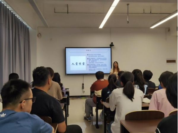 张晶晶老师则主要从生活细节出发,叮嘱大家新生融入校园、融入集体是开始大学生活最重要的一步。凡事预则立不预则废,学会独立处事生活是每个新生的必修课。随后张老师从“军训,学习,生活、兼职、恋爱”五个方面具体描述了大学生活的细节,在学习方面提倡自主、创新、科学、终身、全方位的理念,科学的学习方法才能使学习进步。在生活中以“独立、管理、情绪,健康” 的理念引导新生。在新生中引起广泛共鸣。
