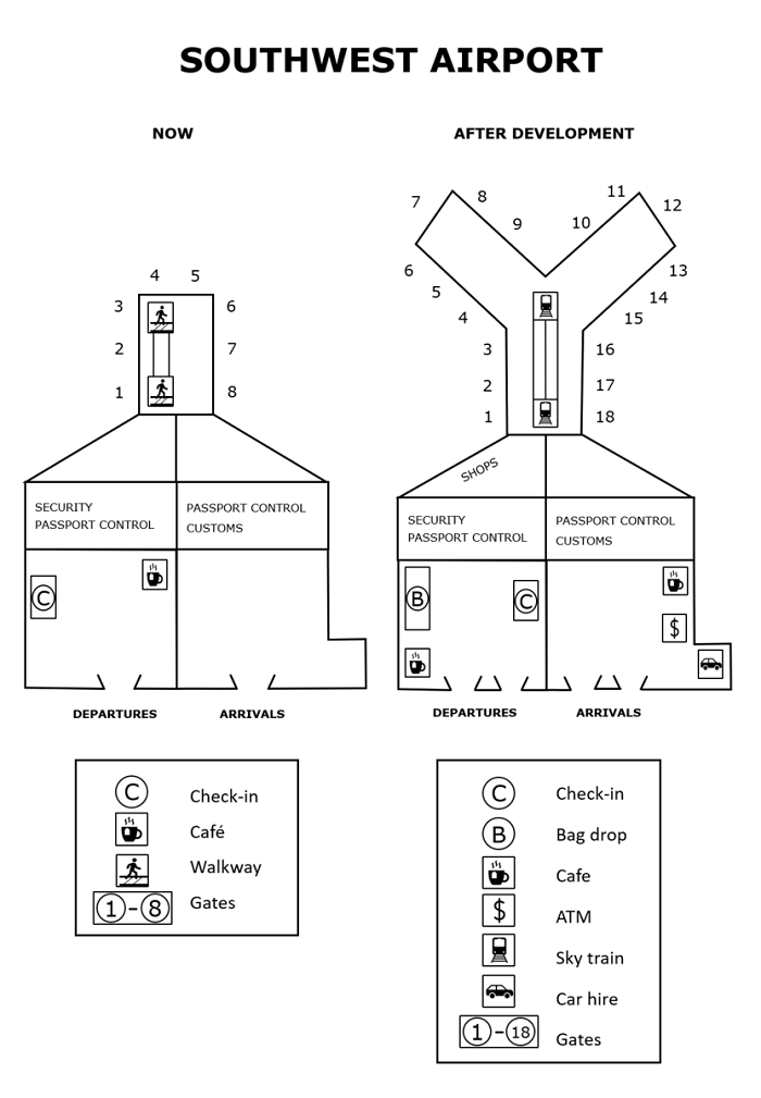 图中描绘了西南机场现在的样子,以及一年后改造工程完成后同一地方的样子。