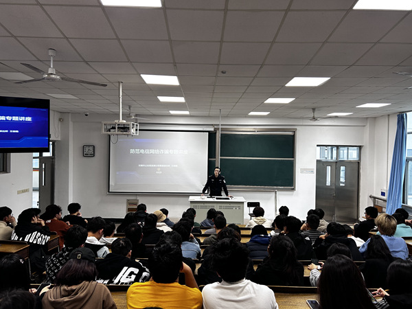 近年来,大学生校园诈骗案件花样不断, 案值不断增大, 部分不法分子利用在校生阅历浅, 安全防范意识差等弱点, 潜入校园诈骗钱财。为帮助学生提高对诈骗的认知, 王警官首先详细讲解了刷单等假冒客服等电信诈骗形式, 让学生们切实感受电信诈骗的危害性和潜伏性, 更有效地识别电信诈骗行为;其次,讲解了大量校园诈骗案件,增强学生对校园诈骗尤其是网络诈骗的风险防范意识, 切实维护广大学生的合法权益, 保障学生的人身财产安全;最后,王警官对本次安全教育进行了总结, 强调“防电信网络诈骗,提高安全意识”是每个公民应尽的义务,树立正确的心理健康安全意识, 是建设和谐校园的基石。