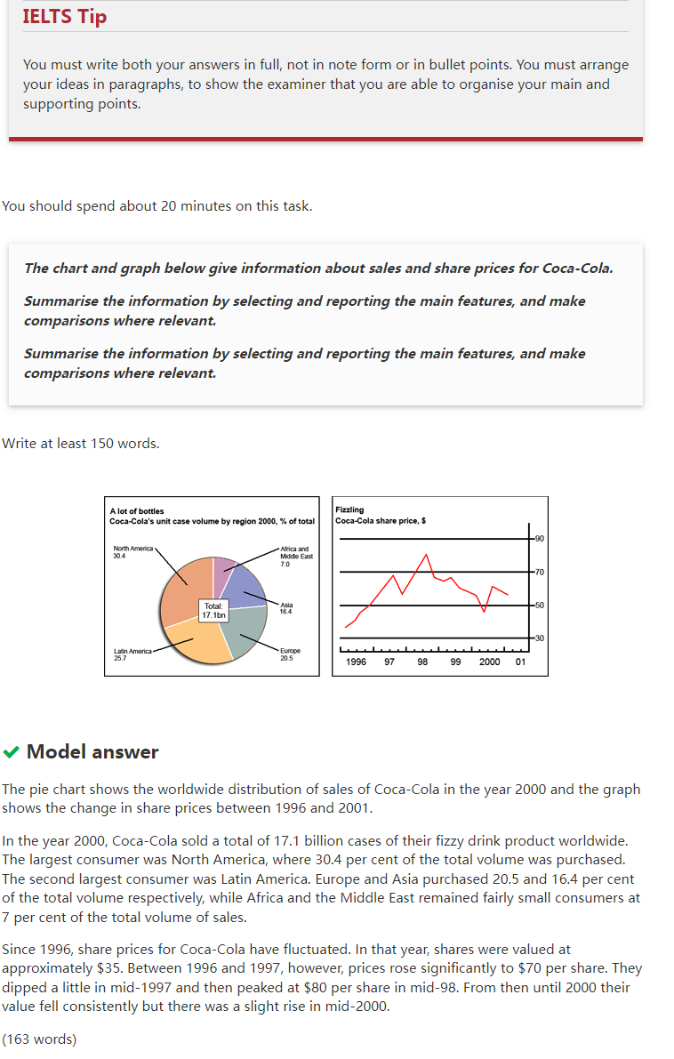饼图显示了 2000 年可口可乐的全球销量分布,图表显示了 1996 年至 2001 年间股价的变化。