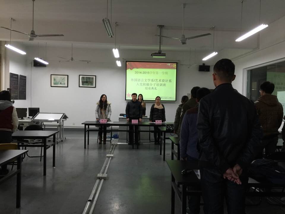 2014年12月16日下午三点,艺术设计系/外国语言文学系2014-2015学年第1期分党校结业典礼在玛雅吧 新工业中心BN508教室隆重举行。外语系商务英语班学生陆雯为主持人,外语系党总支书记王占东老师、外语系学生党支部书记周嫄老师、艺术系学生党支部书记李湘老师以及全体分党校学员参加了此次典礼。
