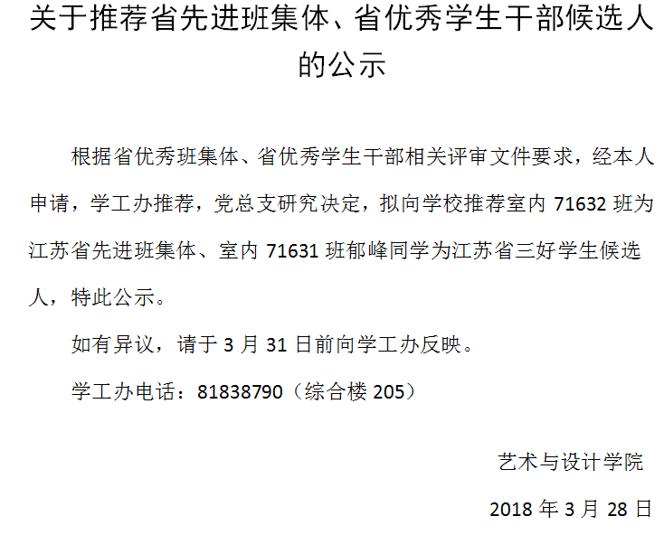 关于推荐省先进班集体、省优秀学生干部候选人的公示