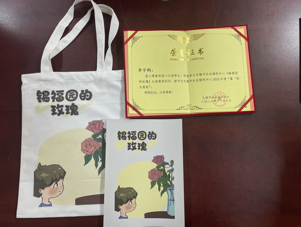 朱凤珍老师代表福利中心向学院赠予了荣誉证书和奖杯,向设计学院师生的付出表示感谢,对同学们在漫画创作过程中展现出的专业能力、责任心和使命感给予了高度肯定。她表示福利中心是凝聚爱、接收爱,也是播种爱的地方,希望同学们能够将萤火微光持续传递。随后,她向同学们赠送了漫画册成品和周边文创产品,同学们欣赏着自己的作品,成就感、自豪感油然而生。