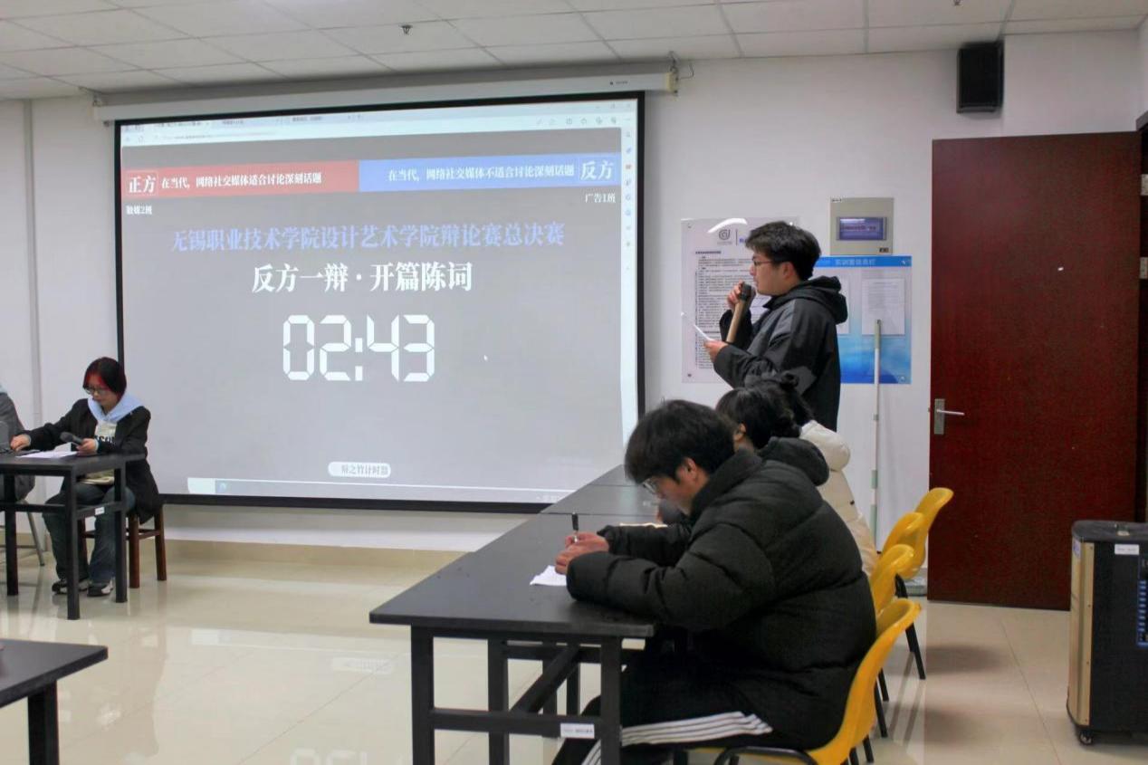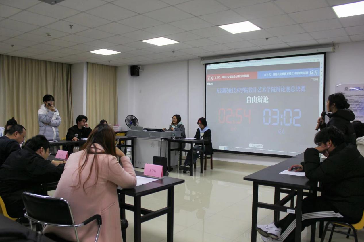 为提高学生思辨能力,营造更加团结愉快的学习氛围,11月至12月,设计艺术学院面向大一新生开展辩论赛活动,并于12月13日在综合楼403举行辩论赛决赛。参与决赛的辩手分别来自数媒23322班和广告23321班,双方就“在当代,社交媒体适合/不适合讨论深刻问题”这一论点展开辩论。学生会学习部潘可琰担任此次比赛主持人,辅导员、班主任担任本次比赛评委。