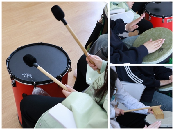 在二级鼓圈引导师林佳燕的带领下,大家围坐成圈,用手中的非洲鼓、木制乐器、金属乐器、散响乐器进行了与众不同的自我介绍;随着开始、停止、音量、音高、速度等手势和肢体语言的引导,同学们逐渐破冰,建立连接,凝聚成一个整体;在“分组”与“塑型”环节,铿锵有力的“嘿哈”声伴随着不同乐器的声音,将活动氛围推向高潮。在“跳爆米花”环节,每位同学轮流来到圈子中尝试引导,有的即兴创编节奏,有的发出“跟随”指令开展互动,在鼓声与节奏的融合下,现场回荡着自由而丰富的旋律,每个人都全神贯注、全情投入,享受着音乐带来的松弛和快乐。