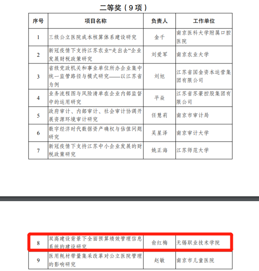 近日,2020年度江苏省社科应用研究精品工程(财经发展专项)获奖结果公布,经省社科联党组审定,全省共评定一等奖5项、二等奖9项、三等奖14项。我校财务处俞红梅教授团队申报的《双高建设背景下全面预算绩效管理信息系统的建设研究》获二等奖,是本年度该等次获奖中唯一一所高职院校代表。