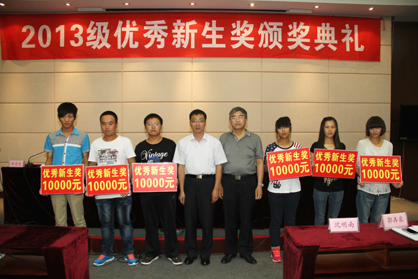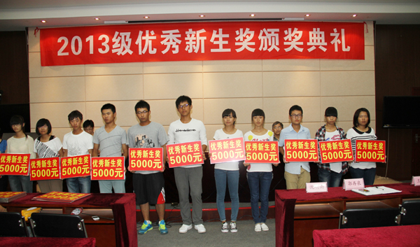 65名学生“2013级优秀新生”荣誉,与会嘉宾还为同学们颁发了奖学金。(郁飞)